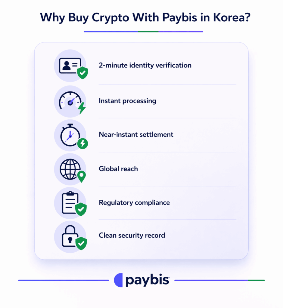 Using an international Visa or Mastercard on Paybis takes under 10 minutes, including a 2-minute identity verification step and instant processing (under 1 minute). No Korean phone number, resident registration number, or local bank account is required.