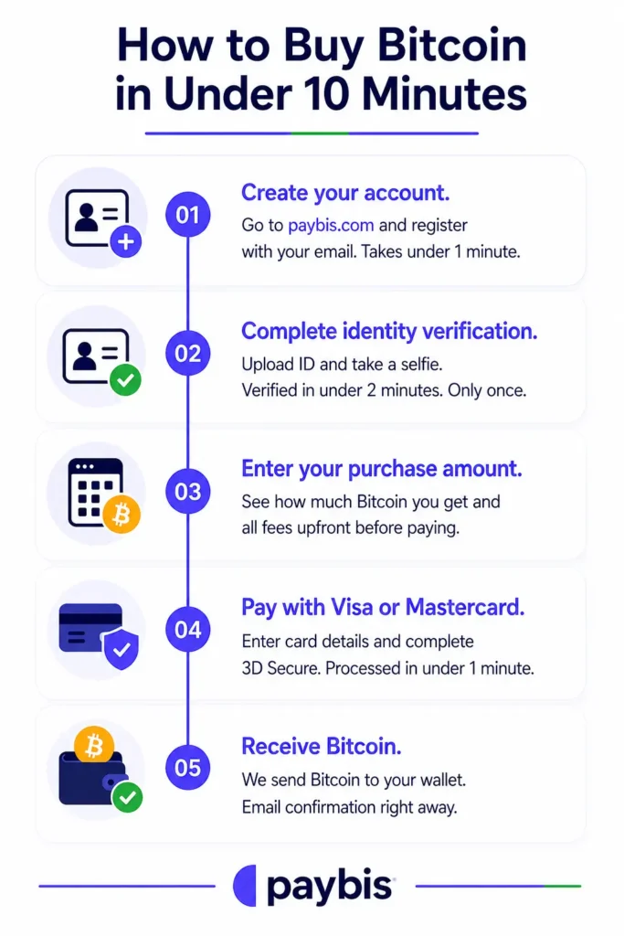 Ready to buy Bitcoin now? Create a Paybis account, complete identity verification in under 2 minutes, and see the exact cost of your purchase before confirming. Fees start from 1.49%, and the total is shown before you click confirm.