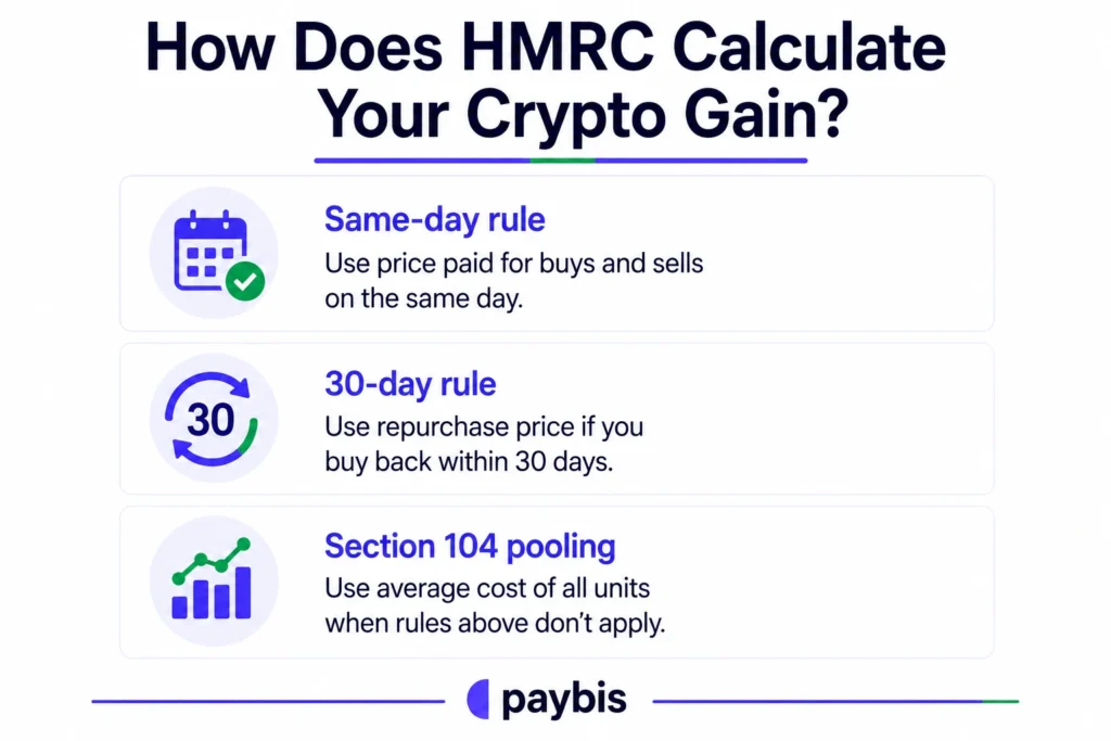 HMRC requires you to use three cost basis rules in a specific order: the same-day rule, the 30-day bed and breakfasting rule, and Section 104 pooling. You cannot choose the method that produces the lowest gain.