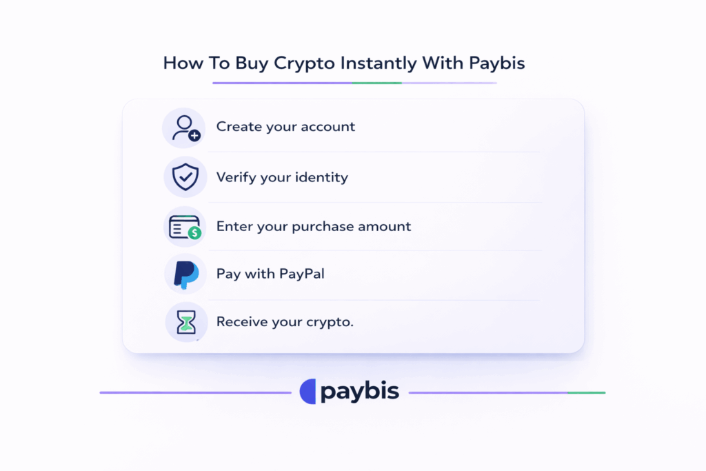 The full process from account creation to crypto in your wallet takes most users under 15 minutes. Here is exactly how it works, as shown in the Paybis PayPal beginner guide: